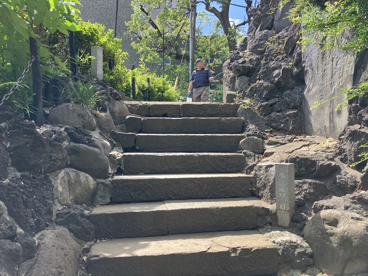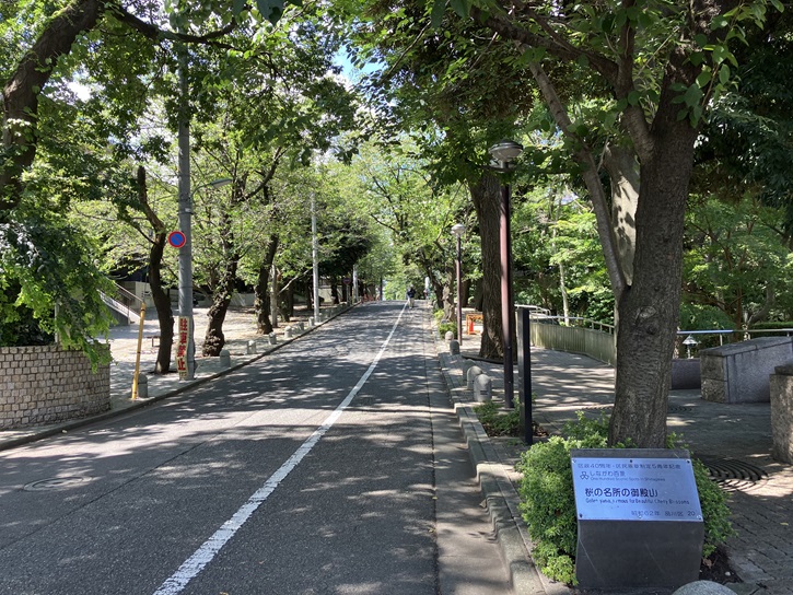 御殿山の坂は、長さが約150mほどの狭く急な坂です。江戸時代にこの辺りは徳川将軍の御料地であり、御殿山と呼ばれていたことに因んで坂名が付きました。
