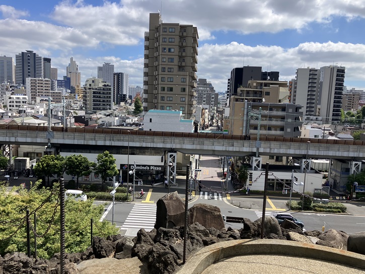スタート地点の京浜急行の新馬場駅北口から歩き始めます。第一京浜(国道15号線)を挟んだ反対側の台地の上に品川神社があります。