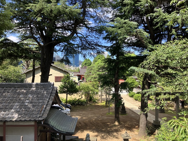 山頂からの眺めは、東側は京急の高架が眼下に眺められて見晴らしがいいのですが、西側は木々に邪魔されて富士山を拝むことができません。富士塚を造るときは、頂上から富士山が見えるように山頂を設計すると聞いたのですが、今まで一度も富士山は見えなかったですね。