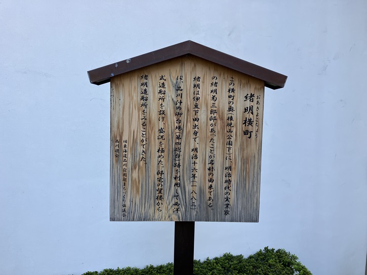 この横丁の奥(権現山公園下)に、明治時代の実業家の緒明菊三郎邸があったことが名称の由来である。緒明は伊豆下田出身で、明治十六年(1883年)に、品川沖の御台場(第四砲台)跡を利用して西洋式造船所を設け、盛況を極めた。邸宅の望楼から緒明造船所をみることができた。