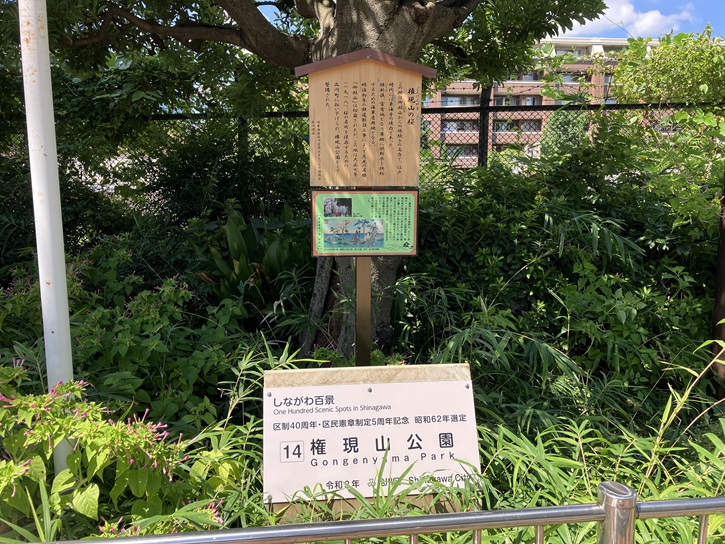 ここ権現山から北の御殿山、さらに高輪台へと連なる小高い丘陵地帯は、関東台地が東の海へと突き出した最先端に位置し、大変に眺めがよく、特に御殿山は江戸時代から「海が見える桜の名所」として人気のスポットであった。現在も桜の季節には、江戸の昔を忍ばせる風景が広がっており、人々が憩い交流するのに格好の公園となっている。