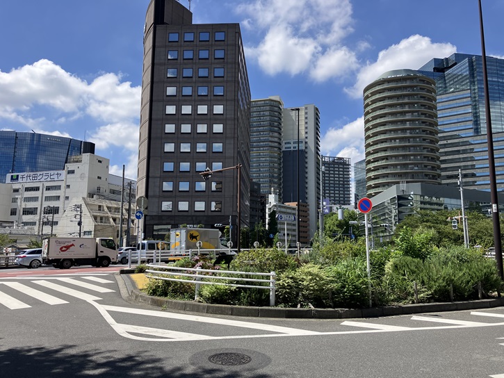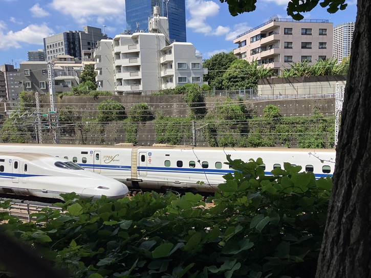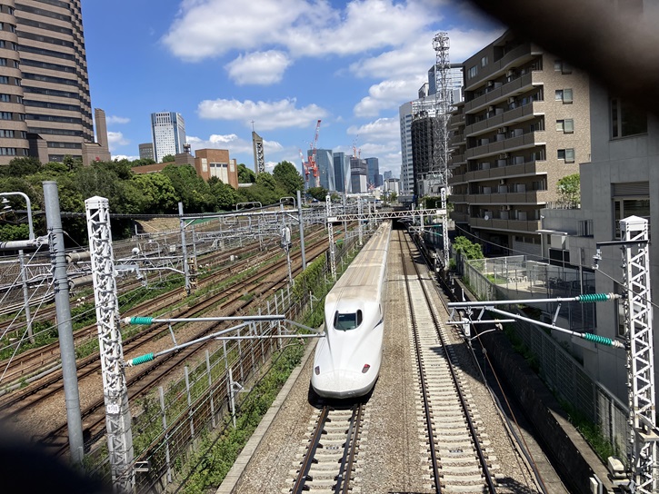 跨線橋からJRの線路を眺めますと、山手線・京浜東北線・東海道線、それに新幹線の電車が走っている様子が見て取れます。鉄道マニアなら一日中眺めていても飽きませんね。