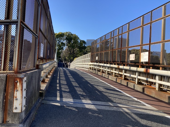 御殿山の坂は、御殿山の高台から途中で大きく”く”の字に曲がって、目黒川に架かる居木橋付近に出て山手通りに合流します。