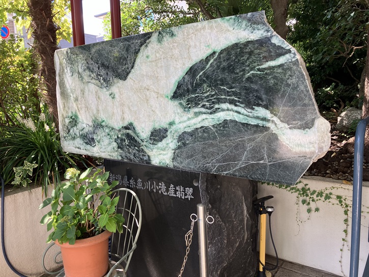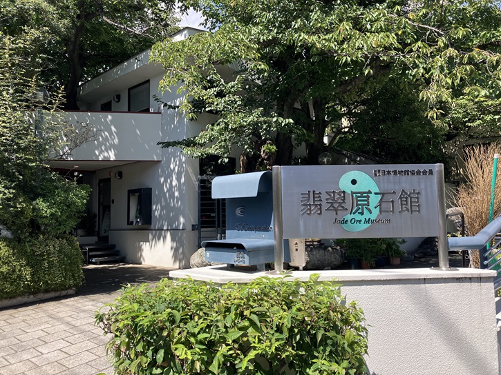 大使館のはす向かいには翡翠原石館があります。翡翠は古代から世界中で崇められてきたパワーストーンで、深緑の半透明な鉱物です。東洋や中南米では古くから宝石のひとつとして珍重され、古代には玉(ぎょく)と呼ばていました。日本では新潟県糸魚川市地域が産地として知られています。翡翠原石館は2002年に開館した個人所有の展示館です。館長が約30年かけて世界中から収集したさまざまな色・形の翡翠を展示しています。入館すると先ず目に飛び込んでくるのは、10万個の石を使い6年の歳月をかけて制作された巨大なモザイク画で、古事記に登場する「奴奈川姫」と「カワセミ」が描かれています。また、糸魚川産の翡翠を数十トン刳り抜いた総翡翠造りのお風呂や、巨大な翡翠原石と植物のコントラストが美しい中庭も必見です。原石ギャラリーでは展示だけでなく販売も行っています。