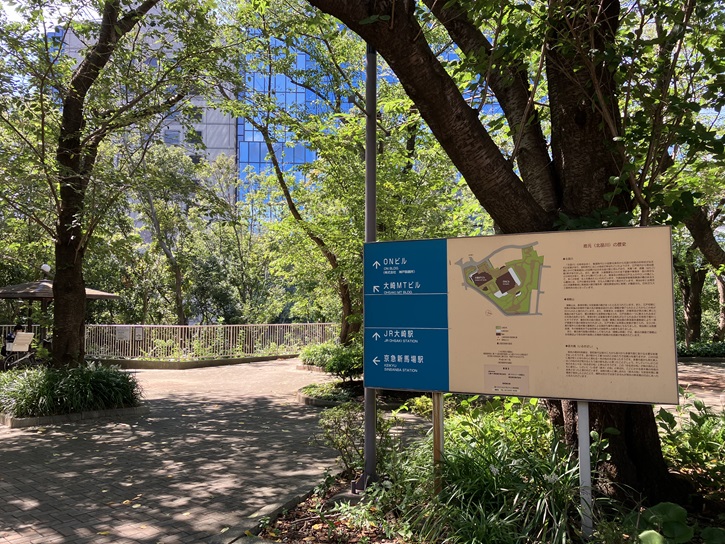 御殿山から目黒川に向かって下っている大崎ビジネスガーデンには、神戸製鋼グループが入居するONビルと大崎MTビルがあり、周囲は公開緑地になっています。