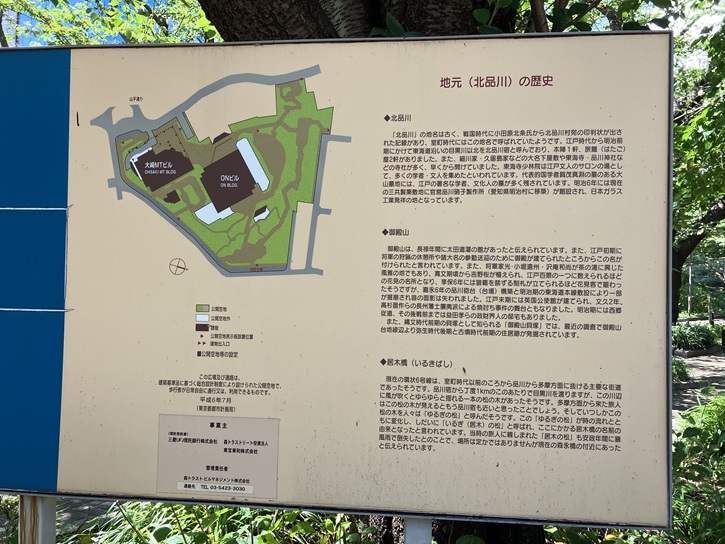 御殿山は、長禄年間に太田道灌の館があったと伝えられています。また、江戸初期に将軍の狩猟の休憩所や諸大名の参勤送迎のために御殿が建てられたところからこの名が付けられたと言われています。また、将軍家光・小堀遠州・沢庵和尚が茶の湯に興じた風雅の地でもあり、寛文期頃から吉野桜が植えられ、江戸百景の一つに数えられるほどの花見の名所となり、享保六年には狼藉を禁ずる制札が立てられるほど花見客で賑わったそうですが、嘉永六年の品川砲台(台場)構築と明治期の東海道本線敷設により一部が掘崩され昔の面影は失われました。江戸末期には英国公使館が建てられ、文久二年、高杉晋作らの長州藩士攘夷派による焼討ち事件の舞台ともなりました。明治期には西郷従道、その後戦前までは益田孝らの政財界人の邸宅もありました。また、縄文時代前期の貝塚として知られる「御殿山貝塚」では、最近の調査で御殿山台地緑辺より弥生時代後期と古墳時代前期の住居跡が発掘されています。