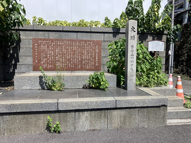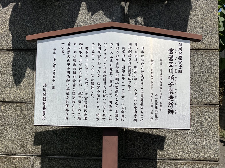 東海道線・京浜東北線の高架の手前の路地の入口角に、日本で最初の西洋式硝子工場跡の記念碑が建っています。この場所には、明治六年(1873年)に日本最初のガラス工場である「興業社」が創設されました。その後官営の「品川硝子製造所」となりましたが、紆余曲折を経た後の明治二十五年(1892年)に解散となりました。敷地の多くと設備は製薬会社の「三共」に引き継がれ、また技術者などは「品川白煉瓦」・「日本光学(ニコン)」・「東京電気(東芝)」などに引き継がれました。品川硝子製造所の煉瓦造りの工場建屋の一部は、現在愛知県の明治村に移築され保存されています。