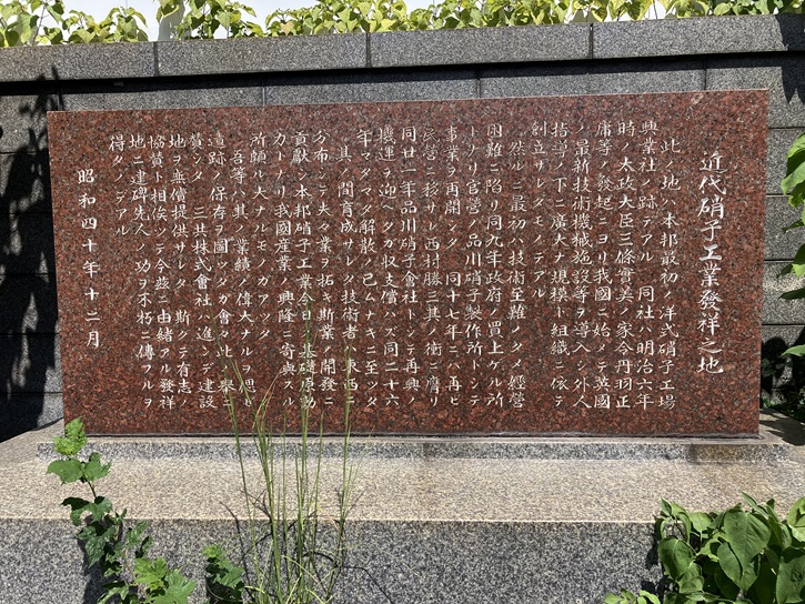 此ノ地ハ本邦最初ノ洋式硝子工場興業社ノ跡デアル。同社ハ明治六年時ノ太政大臣三條實美ノ家令丹羽正庸等ノ發起ニヨリ我國ニ始メテ英國ノ最新技術機械施設等ヲ導入シ、外人指導ノ下ニ廣大ナ規模ト組織ニ依テ創立サレタモノデアル。然ルニ最初ハ技術至難ノタメ經営困難ニ陥リ、同九年政府ノ買上ゲル所トナリ、官營ノ品川硝子製作(造)所トシテ事業ヲ再開シタ。同十七年ニハ再ビ民營ニ移サレ西村勝三其ノ衝ニ膺リ、同廿一年品川硝子會社トシテ再興ノ機運ヲ迎ヘタガ、収支償ハズ同二十六年マタマタ解散ノ己ムナキニ至ツタ。其ノ間育成サレタ技術者ハ東西ニ分布シテ夫々業ヲ拓キ、斯業ノ開發ニ貢獻シ本邦硝子工業今日ノ基礎原動力トナリ、我國産業ノ興隆ニ寄與スル所顧ル大ナルモノガアッタ。吾等ハ其ノ業績ノ偉大ナルヲ偲ビ遺跡ノ保存ヲ圖ッタガ、會々此ノ擧ニ賛シタ。三共株式會社ハ進ンデ建設地ヲ無償提供サレタ。斯クテ有志ノ協賛ト相俟ツテ今茲ニ由緒アル發祥地ニ建碑先人ノ功ヲ不朽ニ傅フルヲ得タノデアル。