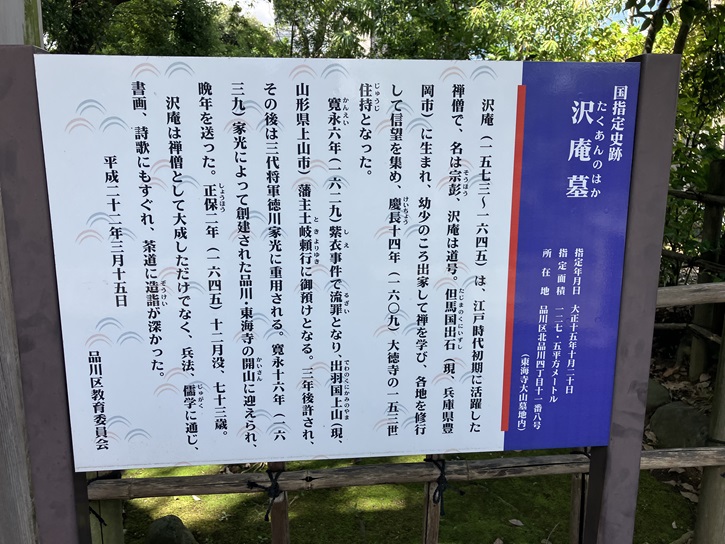 茲は東海寺開山澤庵和尚墳墓の地なり。正保年間より幾ゝ度の変遷をへて今日に至る。澤庵和尚死に臨んで遺偈を残す。