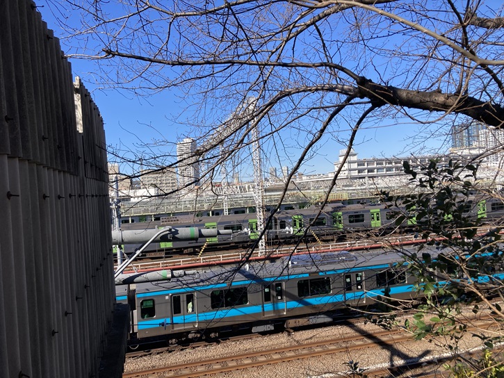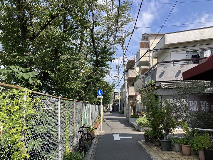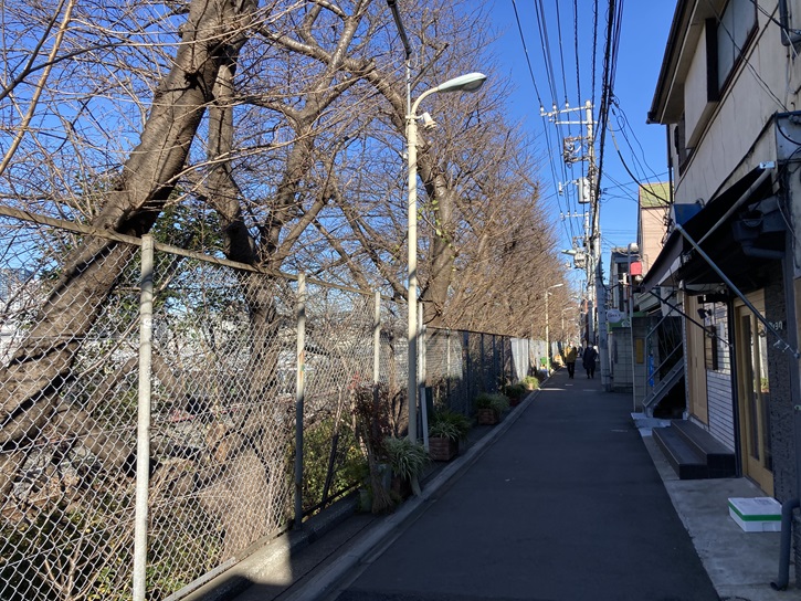 線路沿いの細い道路は転落防止用のフェンスで線路と仕切られていますが、その隙間に桜の並木が続いています。今は桜の季節ではありませんが、春になると桜のトンネルが出現します。