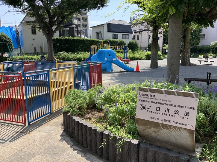大井町駅線路沿いから「品川寺」に向かいます。浅間台小学校の角で右折し、住宅街の中を進みます。右手に小さな公園があります。二日市公園は「しながわ百景」にも選ばれていて、四季折々の花々が植えられた花壇が整備されています。遊具は、コンビネーション遊具・ブランコ・すべり台・砂場・健康遊具などが設置され、すべり台は象をモチーフにした幼児向けのものになっています。公園奥にはフェンスで囲まれたスペースもあり、ボールを使った遊びもできます。
