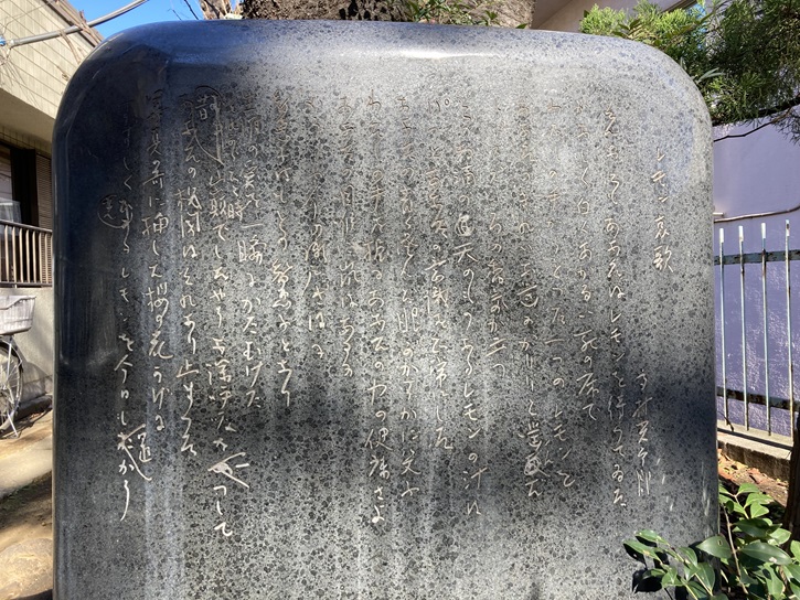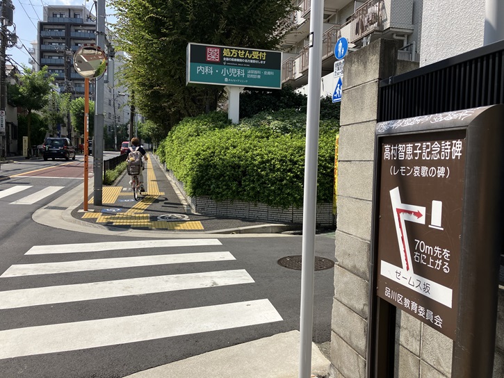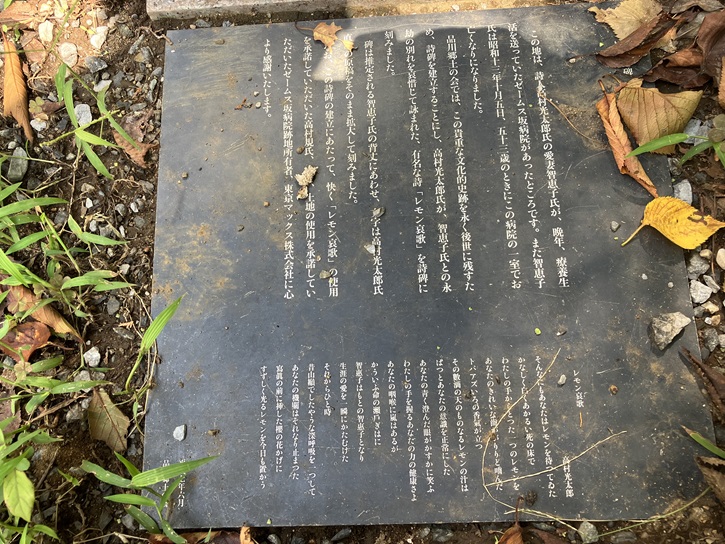 ゼームス坂マンションの向かいに、民家に挟まれた細い坂が上がっています。坂の途中に「高村智恵子ゆかりの地 文学詩碑」の立て札と共に、夫の高村光太郎が智恵子の最後を描いた「レモン哀歌」が刻まれた石碑が建っています