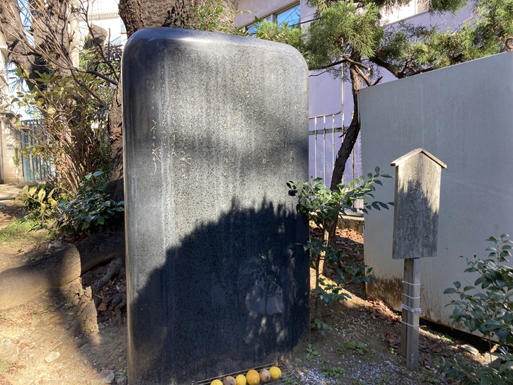 この地は、詩人高村光太郎氏の愛妻智恵子氏が、晩年、療養生活を送っていたゼームス坂病院があったところです。また智恵子氏は昭和十三年十月五日、五十三歳のときにこの病院の一室でお亡くなりになりました。品川郷土の会では、この貴重な文化的史跡を永く後世に残すため、詩碑を建立することにし、高村光太郎氏が、智恵子氏との永劫の別れを哀惜して詠まれた、有名な詩「レモン哀歌」を詩碑に刻みました。碑は推定される智恵子氏の背丈にあわせ、文字は高村光太郎氏直筆の原稿をそのまま拡大して刻みました。なお、この詩碑の建立にあたって、快く「レモン哀歌」の使用を承諾していただいた高村規氏、??、土地の使用を承諾していただいたゼームス坂病院跡地所有者、東京マックス株式会社に心より感謝いたします。