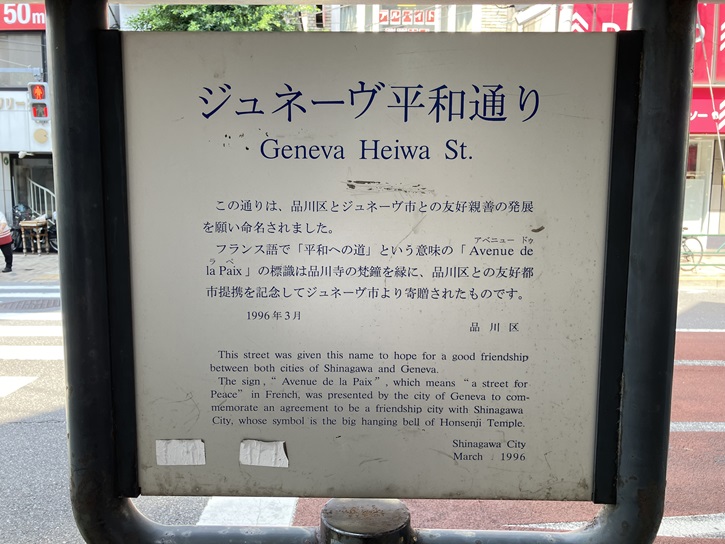 この通りは、品川区とジュネーヴ市との友好親善の発展を願い命名されました。フランス語で「平和への道」という意味の「Avenue de la Paix」の標識は品川寺の梵鐘を縁に、品川区との友好都市提携を記念してジュネーヴ市より寄贈されたものです。