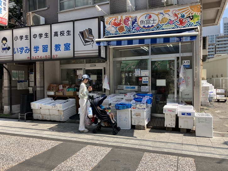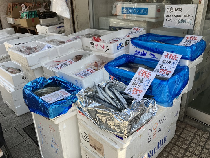 交差点の先に魚屋さんがあります。今時珍しい丸のままの魚が店先に並んでいます。神奈川産の釣りたての大ぶりな太刀魚もありますね。お刺身にしたら美味しそう。