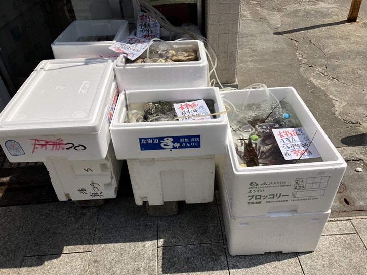 旬のサンマも山積みです。伊勢エビもアワビもサザエもハマグリも活きています。伊勢エビなんかヒゲがぴくぴく動いていますもん。お魚も貝類もワタ抜き・皮ひき・3枚おろし・殻とりなど調理してもらえるそうです。お散歩の終りなら太刀魚の3枚おろしを頼むんですがね。