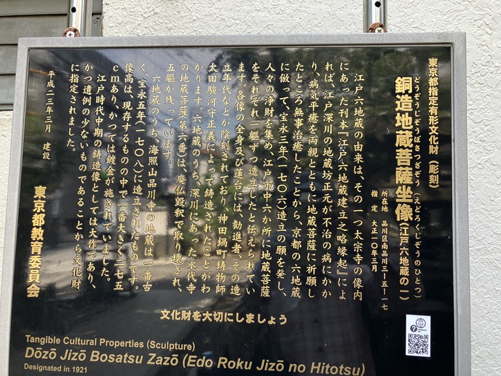 江戸六地蔵の由来は、その一つ太宗寺の像内にあった刊本「江戸六地蔵建立之略縁起」によれば、江戸深川の地蔵坊正元が不治の病にかかり、病気平癒を両親とともに地蔵菩薩に祈願したところ無事治癒したことから、京都の六地蔵に倣って、宝永三年(1706年)造立の願を発し、人々の浄財を集め、江戸市中六か所に地蔵菩薩をそれぞれ一躯ずつ造立したと伝えられています。各像の全身及び蓮台には、勧進者、その造立年代などが陰刻されており、神田鍋町鋳物師太田駿河守正義によって鋳造されたことがわかります。六地蔵のうち、深川にあった永代寺の地蔵菩薩(第六番)は、廃仏毀釈で取り壊され、五躯が残っています。六地蔵のうち、海照山品川寺の地蔵は一番古く、宝永五年(1708年)に造立されたものです。像高は、現存するものの中で一番大きく275cmあり、かつては鍍金が施されていました。江戸時代中期の鋳造像としては大作であり、かつ遺例の少ないものであることから文化財に指定されました。