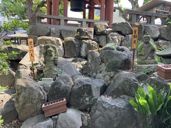 品川寺には、一ヵ所で七福神詣でができる金生(かのう)七福神があります。金生七福神は鐘突き堂の周りを囲むように七福神像が分散して並べてあり、何れも高さ50cmから80cmの石像です。左から、布袋尊・大黒天・恵比寿・寿老人・福禄寿・毘沙門天・弁財天の順になっています。ちなみに、品川寺の東海七福神は毘沙門天で、本堂内に祀られています。