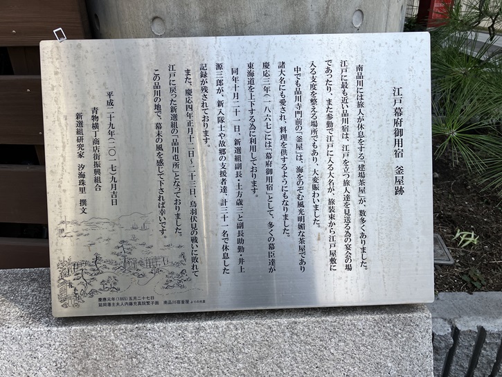 南品川には旅人が休息をする「建場茶屋」が、数多くありました。江戸に最も近い品川宿は、江戸を立つ旅人達を見送る為の宴会の場であったり、また参勤で江戸に入る大名が、旅装束から江戸屋敷に入る支度を整える場所でもあり、大変賑わいました。中でも品川寺門前の「釜屋」は、海をのぞむ風光明媚な茶屋であり諸大名にも愛され、料理を供するようにもなりました。慶応三年(1867年)には「幕府御用宿」として、多くの幕臣達が東海道を上下する為に利用しております。同年十月二十一日、新選組副長・土方歳三と副長助勤・井上源三郎が、新入隊士や故郷の支援者達、計三十一名で休息した記録が残されております。また、慶応四年正月十二日〜二十三日、鳥羽伏見の戦いに敗れて江戸に戻った新選組の「品川屯所」となっておりました。この品川の地で、幕末の風を感じて下されば幸いです。