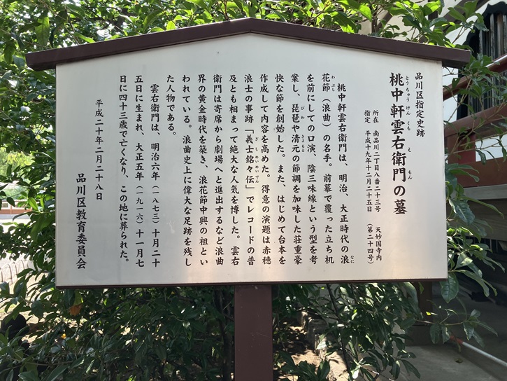 桃中軒雲右衛門は、明治、大正時代の浪花節(浪曲)の名手。前幕で覆った立ち机を前にしての口演、陰三味線という型を考案し、琵琶や清元の節調を加味した荘重豪快な節を創始した。また、はじめて台本を作成して内容を高めた。得意の演題は赤穂浪士の事跡「義士銘々伝」でレコードの普及とも相まって絶大な人気を博した。雲右衛門は寄席から劇場へと進出するなど浪曲界の黄金時代を築き、浪花節中興の祖といわれている。浪曲史上に偉大な足跡を残した人物である。雲右衛門は、明治六年(1873年)十月二十五日に生まれ、大正五年(1916年)十一月七日に四十三歳で亡くなり、この地に葬られた。