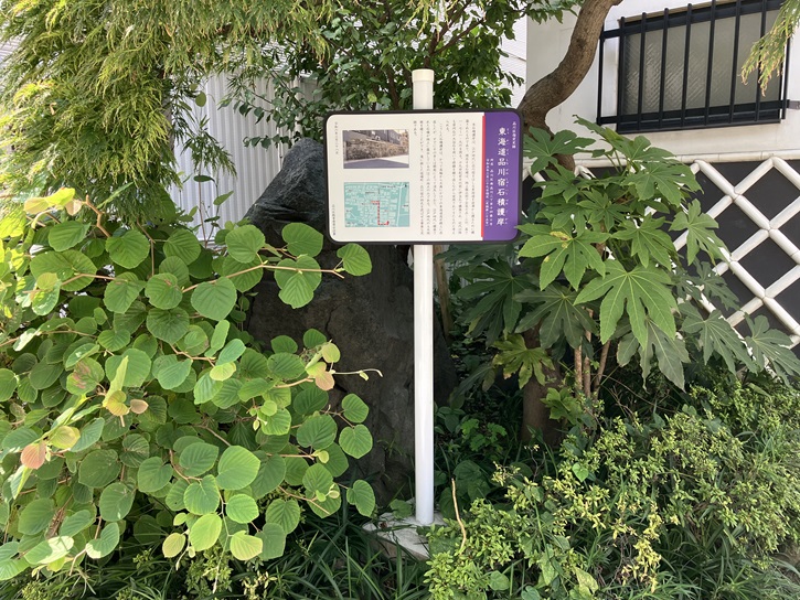 かっての東海道品川宿は、東京湾に面していました。そのため、高潮を防ぐための防波堤が築かれていました。実物は見ませんでしたが、写真のような石垣が東海道に沿って延々と続いていたんですね。石は遠方から運ばれたもので、先人の苦労が偲ばれます。