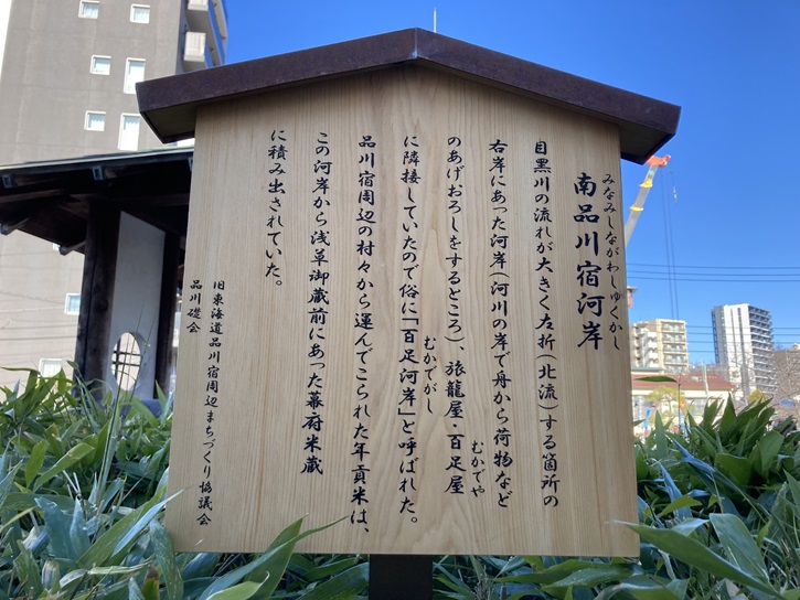 目黒川の流れが大きく左折(北流)する箇所の右岸にあった河岸(河川の岸で舟から荷物などのあげおろしをするところ)、旅籠屋・百足屋に隣接していたので俗に「百足河岸」と呼ばれた。品川宿周辺の村々から運んでこられた年貢米は、この河岸から浅草御蔵前にあった幕府米蔵に積み出されていた。