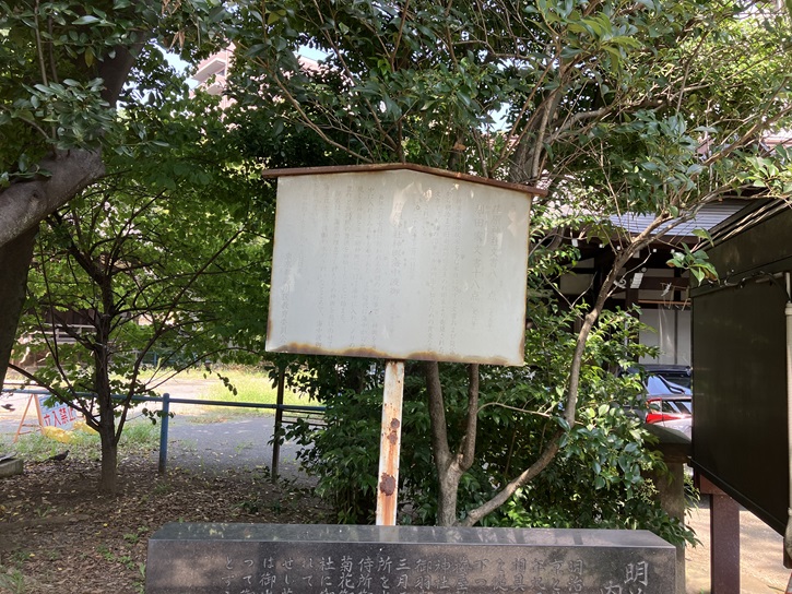 石碑の後ろに、文字が殆ど消えかかった案内板が立っています。