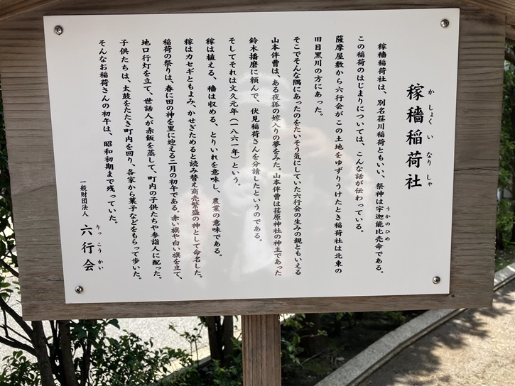 稼穡稲荷社は、別名荏川稲荷ともいい、祭神は宇迦能比売命である。この稲荷のはじまりについては、こんな話が伝わっている。薩摩屋敷から六行会がこの土地をゆずりうけたとき稲荷社は北東の旧目黒川の方にあった。そこでそんな隅にあったのをたいそう気にしていた六行会の生みの親ともいえる山本伴曹は、ある夜狐の嫁入りの夢をみた。山本伴曹は荏原神社の神主であった鈴木播磨に頼んで、伏見稲荷さんを分請したというのである。そしてそれは文久元年(1861年)という。稼は植える、穡は収める、とりいれを意味し、農業の意味である。稼はカセギともよみ、かせぎためると読み替え商売繁盛の神として命名した。稲荷の祭りは、春に田の神を里に迎える二月の初午である。赤い旗や白い旗を立て、地口行灯を立て、世話人が赤飯を蒸して、町内の子供たちや参詣人に配った。子供たちは、太鼓をたたき町内を回り、各家から菓子などをもらって歩いた。そんなお稲荷さんの初午は、昭和初期まで残っていた。