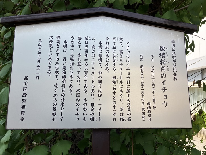 イチョウはイチョウ科に属する落葉の高木で、高さ三十メートルにもなり、葉は扇形で秋に黄葉する。雌雄(めすとおす)それぞれ別の木となる。本樹は雄樹で、幹の囲りは4.1メートル、高さは23メートルあり、推定の樹齢は五百年から六百年である。木の勢いも盛んで、姿も整っており、本区内のイチョウの中でも屈指の巨木である。本樹は、長い間稼檣稲荷社の神木として保護されてきた古木で、遠くからの景観も大変美しい木である。