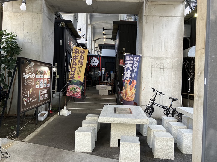 目黒川を大崎橋で渡って右岸の遊歩道を進みます。池上線五反田駅〜大崎広小路駅の高架下に誕生した商業施設「池上線五反田高架下」には、昭和の雰囲気が漂う横丁エリア「五反田桜小路」を含めた全長約230mのこだわりが光る飲食店舗10店が連なっています。高架下とは思えないスタイリッシュなデザインが魅力的な、ゆったりとした居心地のよい空間です。五反田駅に近い横丁エリア「五反田桜小路」には、新鮮な海鮮料理が楽しめる「貝々味海」、おでんと九州料理の「さみしがりや酒房ささ」、ワインバル「東京食堂」、フードバー「ファットBAR」、中華料理の「初代田中餃子」、洋食料理「KITCHEN Crescent」、たこ焼きの「みやたこです。」の7店舗が軒を連ね、気軽に寄れる横丁の雰囲気が味わえます。