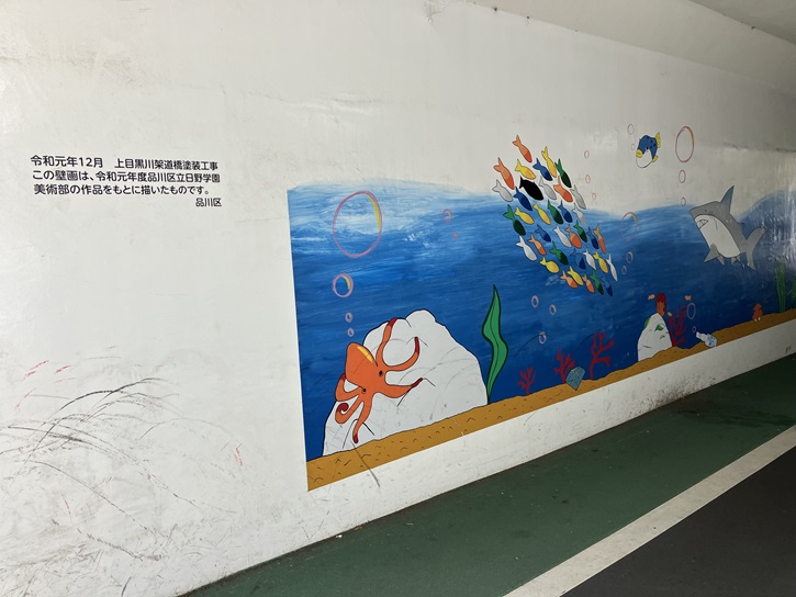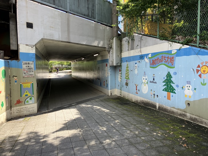 ふれあいK字橋の先で、遊歩道はJR線のガードを潜ります。ガード下の壁には、地元の子どもたちの作品を基にした壁画が描かれています。同じ小どもでも、美術部の部員が描くと大人の絵になります。