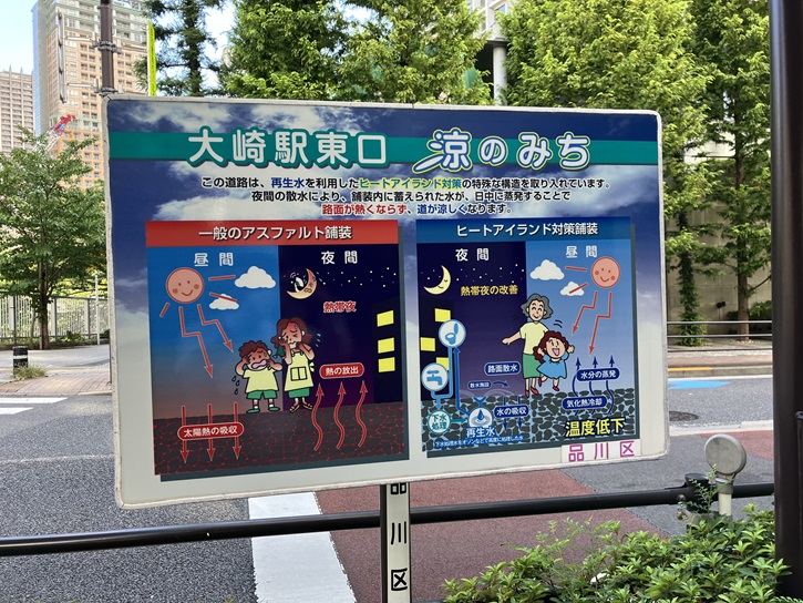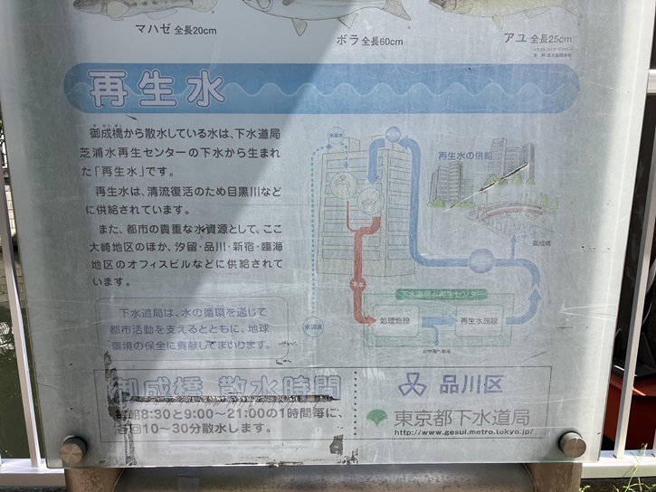 御成橋から散水している水は、下水道局芝浦水再生センターの下水から生まれた「再生水」です。再生水は、清流復活のため目黒川などに供給されています。また、都市の貴重な水資源として、ここ大崎地区のほか、汐留・品川・新宿・臨海地区のオフィスビルなどに供給されています。