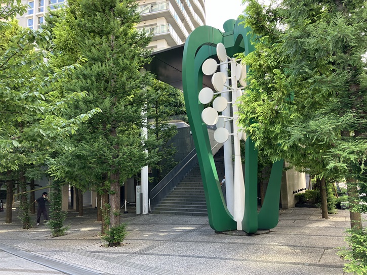 ビュータワーの目黒川沿いの入口横には、巨大なピーマンのモニュメントが置かれています。これはただのアートではなく「フロープス」と呼ばれる防風装置の一種なのだそうです。白い種の部分が風車になっていて、強いビル風を緩和する効果があるのだとか。奇妙なオブジェだとは思っていたのですが、そんな目的もあったんですね。