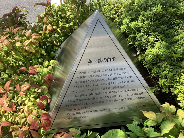 この橋は、大正四年(1915年)当地に森永製菓第二工場が建設されたことに伴って、この工場に通勤する従業員のために、森永製菓が架けた木でできた幅9尺(2.7m)、長さ6間(10.9m)の橋が始まりで、いつのころからか、「森永橋」と呼ばれました。森永製菓は、当初、港区に工場がありましたが、業績が伸びるとともに、品川区の大崎地区に、第二工場を建設しました。この工場に通勤する従業員約200名は、大井・荏原・戸越方面から通う人達で、この橋を渡って工場に通ったそうです。その後、昭和四年3月の目黒川の改修工事により、鉄筋コンクリートの橋に改修され、現在に至っています。