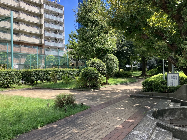 遊歩道の右手に、「北品川ホームズ公園」があります。昭和五十六年(1981年)2月に竣工した地上15階建・総戸数285戸のビッグコミュニティーの「北品川ホームズ」の敷地内に造られ、一般に開放されている公園です。