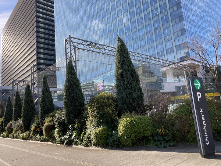 南改札口から東西方向に自由通路が延びていて、西方向に進むと2棟の巨大なビルが建っています。ThinkPark(シンクパーク)は、明電舎工場跡地を再開発して建てられた超高層ビルを中核とする複合施設で、平成十九年(2007年)10月25日にオープンしました。中核となる「ThinkPark Tower」は、地下2階・地上30階建てのタワーで、2階にオフィスエントランスホールを置き、大崎駅とはペデストリアンデッキ(品川夢さん橋)で直結しています。タワー正面に整備された各種イベントやフットサルなどのスポーツに利用できる多目的広場「ThinkPark Arena」は、地域に根ざした賑わいの場を目指しています。ThinkParkの南側には、ソニーの技術開発部門を統合する研究開発型オフィス「NBF大崎ビル(旧ソニーシティ大崎)」が建っています。地上25階・高さ140mのビルの各階は、研究開発型オフィスに相応しい室内に柱のない3、000uの空間となっていて、その周囲には非常時の避難動線となるバルコニーが設けられています。このバルコニーの手摺には、ヒートアイランド現象を抑制する効果が期待できるテラコッタルーバー(バイオスキン)が設置されています。多孔質な陶器製の管でつくられたこのルーバーには、屋上で集められた雨水が通され、その気化熱により周辺空気を冷やすという機能を持ち、現代版の「すだれ」の役割を果たしています。