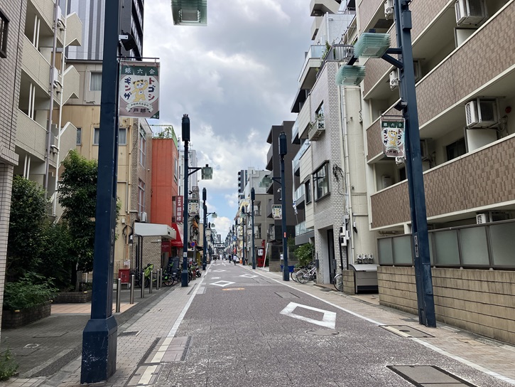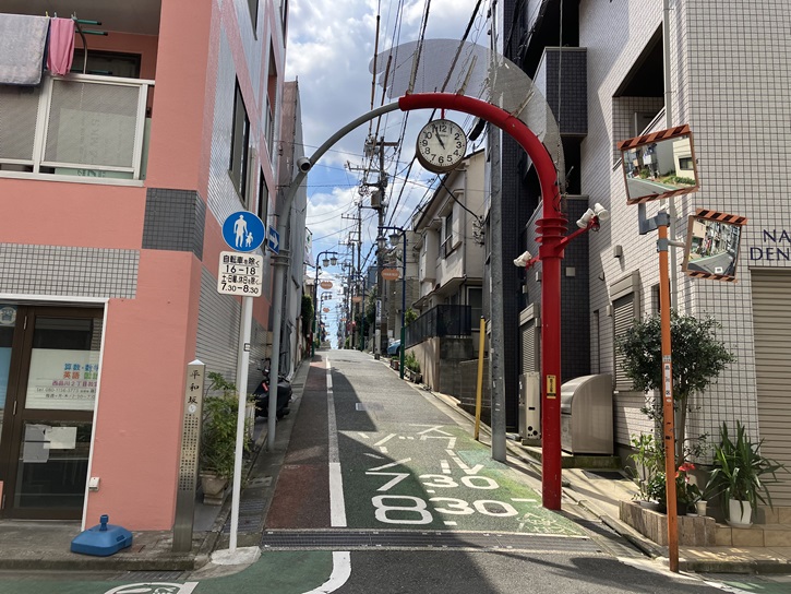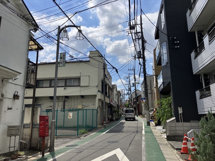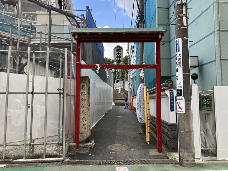 ThinkParkの北西角から居木神社に向かいます。2022年1月に訪れた時は道路の左手には古民家が密集していましたが、2024年9月に再訪した時にはその一画が更地になって高層マンションが建設中でした。