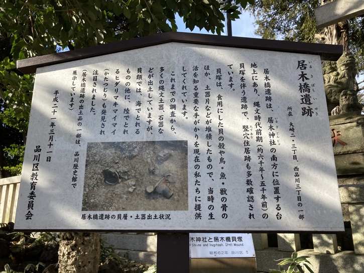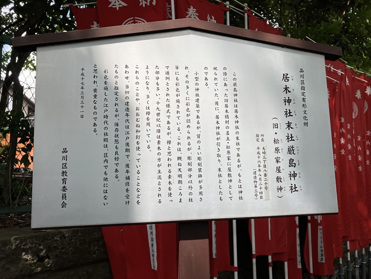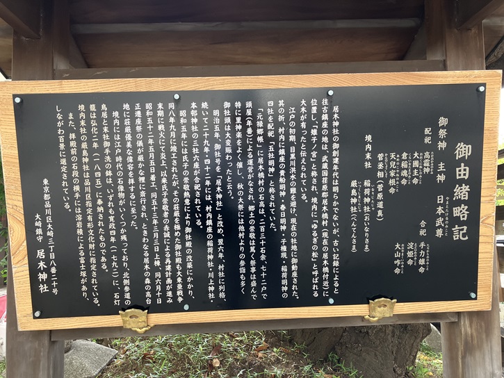 拝殿の横に居木神社の由緒書が立っています。居木神社は、元々は目黒川に架かる居木橋の辺りに鎮座していたのです。