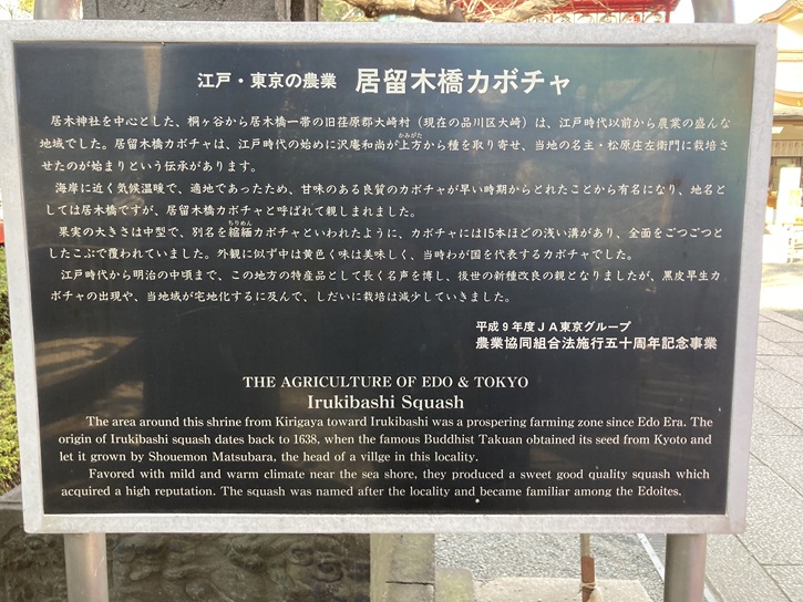 居木神社を中心とした、桐ヶ谷から居木橋一帯の旧荏原郡大崎村(現在の品川区大崎)は、江戸時代以前から農業の盛んな地域でした。居留木橋カボチャは、江戸時代の始めに沢庵和尚が上方から種を取り寄せ、当地の名主・松原庄左衛門に栽培させたのが始まりという伝承があります。海岸に近く気候温暖で、適地であったため、甘味のある良質のカボチャが早い時期からとれたことから有名になり、地名としては居木橋ですが、居留木橋カボチャと呼ばれて親しまれました。果実の大きさは中型で、別名を縮緬(ちりめん)カボチャといわれたように、カボチャには15本ほどの浅い溝があり、全面をごつごつとしたこぶで覆われていました。外観に似ず中は黄色く味は美味しく、当時わが国を代表するカボチャでした。江戸時代から明治の中頃まで、この地方の特産品として長く名声を博し、後世の新種改良の親となりましたが、黒皮早生カボチャの出現や、当地域が宅地化するに及んで、しだいに栽培は減少していきました。