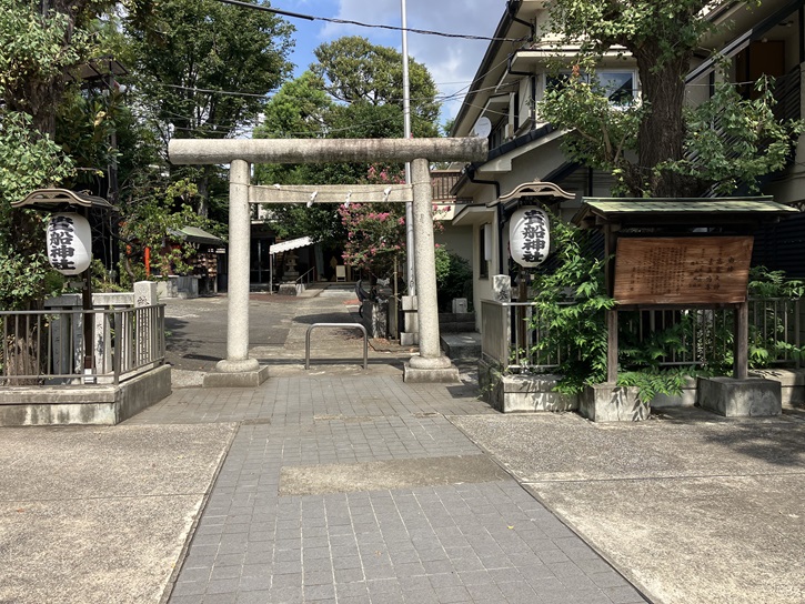 細い参道を進んだ奥に石段があり、段上に大鳥居が聳えています。鳥居の横に居木橋貝塚の案内板が立っています。