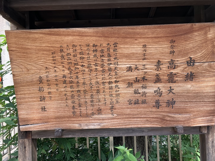 當社は元明天皇の御代和銅二年九月藤原伊勢人の勧請に依り創建せられ、當地方最古のお宮であります。御神威は古来より誠に廣く深く品川(旧三ツ木村)の鎮守として氏子の崇敬厚く昔から信仰の中心として永く栄えて参リました。御社殿は昭和廿年五月戦災を蒙りましたが、西品川氏子六地區の崇敬奉賛の熱意により再建せられました。