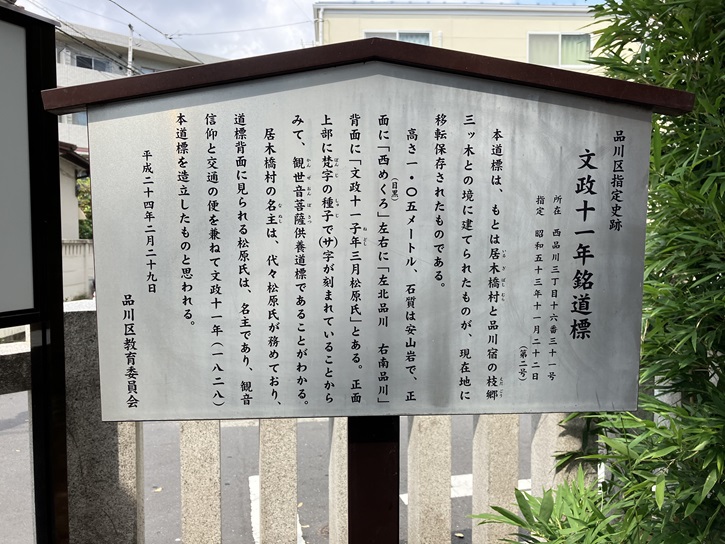本道標は、もとは居木橋村と品川宿の枝郷三ツ木との境に建てられたものが、現在地に移転保存されたものである。高さ1.05メートル、石質は安山岩で、正面に「西めくろ(目黒)」左右に「左北品川 右南品川」背面に「文政十一子年三月松原氏」とある。正面上部に梵字の種子で(サ)字が刻まれていることからみて、観世音菩薩供養道標であることがわかる。居木橋村の名主は、代々松原氏が務めており、道標背面に見られる松原氏は、名主であり、観音信仰と交通の便を兼ねて文政十一年(1828年)本道標を造立したものと思われる。