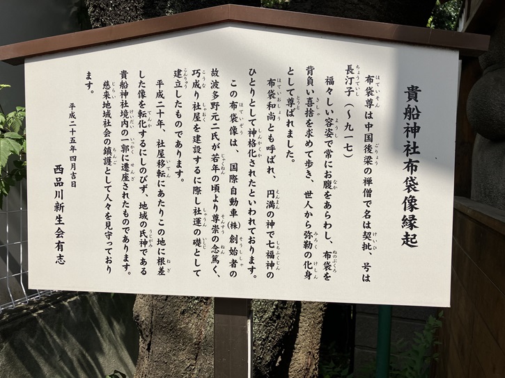 布袋尊は中国後梁の禅僧で名は契批、号は長汀子(〜917年)福々しい容姿で常にお腹をあらわし、布袋を背負い喜捨を求めて歩き、世人から弥勒の化身として尊ばれました。布袋和尚とも呼ばれ、円満の神で七福神のひとりとして神格化されたといわれております。この布袋像は、国際自動車椛n始者の故波多野元二氏が若年の頃より尊崇の念篤く、巧成り社屋を建設するに際し社運の礎として建立したものであります。平成二十年、社屋移転にあたりこの地に根差した像を転化するにしのびず、地域の氏神である貴船神社境内の一郭に遷座されたものであります。慈来地域社会の鎮護として人々を見守っております。