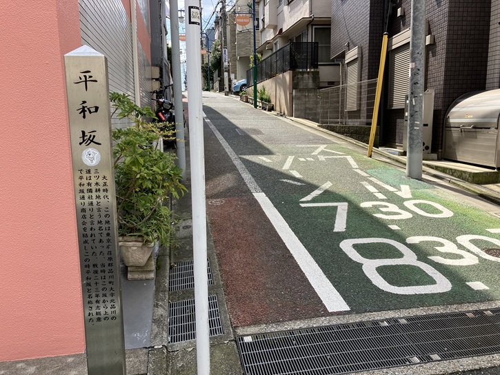 大正時代、この地は東京府荏原郡品川町大字北品川の三ツ木耕地と言う地名であった。当時はこの坂から上の道は有隣社通りと言われていた。戦後二十三年有志総意で平和坂通り商店会を結成し、この時平和坂と名称された。