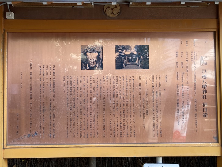 戸越八幡神社は旧戸越村の鎮守で、大永六年(1526年)に行永法師という諸国を行脚していた僧が村内の藪清水池水源地に誉田別命(応神天皇・八幡神)の神体が出現したのを見つけて草庵を作り、そこに京都の石清水八幡宮から分霊を勧請して共に祀ったのが始まりといわれています。人々が祈願するとたちまちに願いが叶うといわれ、成就庵と呼ばれました。文禄元年(1593年)に別当寺だった行慶寺の念誉によって成就庵のところに八幡神社を建立し、ご神体を阿弥陀如来と共に祀ったといわれています。元禄元年に現在地に移転しました。