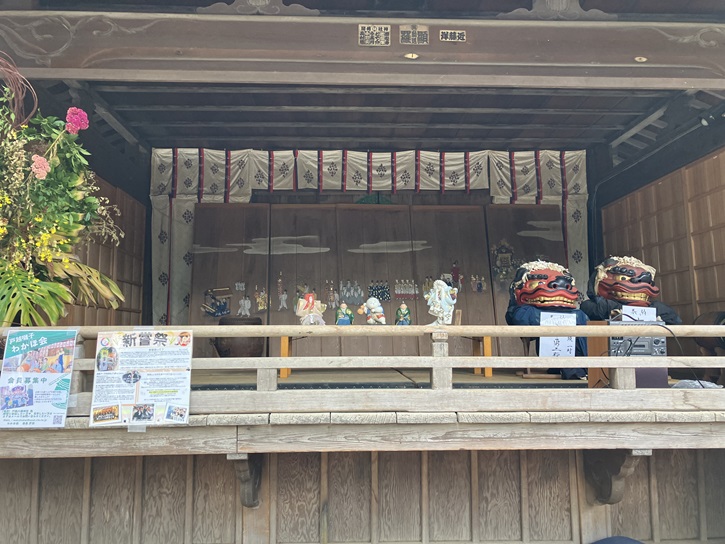 神輿庫には、立派な大神輿が鎮座しています。神楽殿の奥には、大神輿を曳いた祭礼の行列を描いたと思われる幟が掛けられています。、
