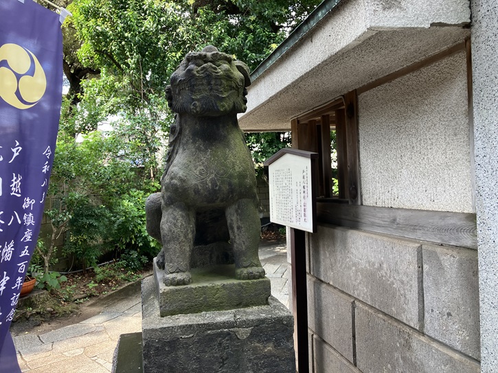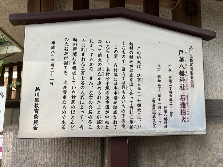 この狛犬は、延享三年(1746年)に、戸越村の村民がお金を出し合って当社に奉納したもので、区内では最も古いものである。この頃、各村落には庚申講が結成されていたらしく、本村や平塚の庚申講が中心となって狛犬の造立が進められたことが銘文によってわかる。また、左右の台石の各三面に刻まれた二百七名の人名によって、当時の戸越村を構成していた村民のほとんどの氏名が把握でき、大変貴重なものである。