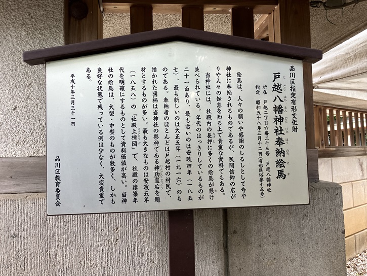 絵馬は、人々の願いや感謝のしるしとして寺や神社に奉納されるものであるが、民間信仰の広がりや人々の知恵を知る上で貴重な資料でもある。当神社には、社殿内の長押に多くの絵馬が懸け並べられている。年代のはっきりしているものが二十一面あり、最も古いのは安政四年(1857年)、最も新しいのは大正五年(1916年)のものである。奉納者のほとんどは戸越村の村民で、描かれた図柄は当神社の祭神である神功皇后を題材とするものが多い。最も大きなものは安政五年(1858年)の「社殿上棟図」で、社殿の建築年代を明確にするものとして資料価値が高い。当神社の絵馬は、大型・中型のものが数多く、しかも良好な状態で残っている例は少なく、大変貴重である。