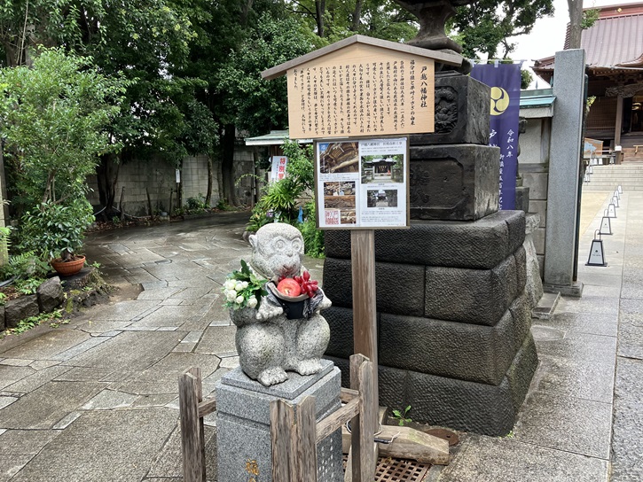 社殿の入口に、「福分け猿と夢叶うさぎの由来」の案内板が立っています。