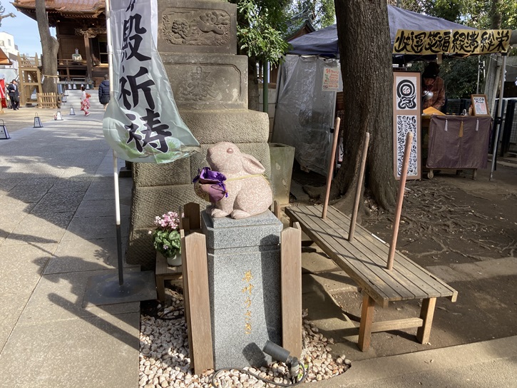 お猿さんは左側の灯籠の前、兎さんは右側の灯籠の前で参拝者に福と夢を授けておいでです。